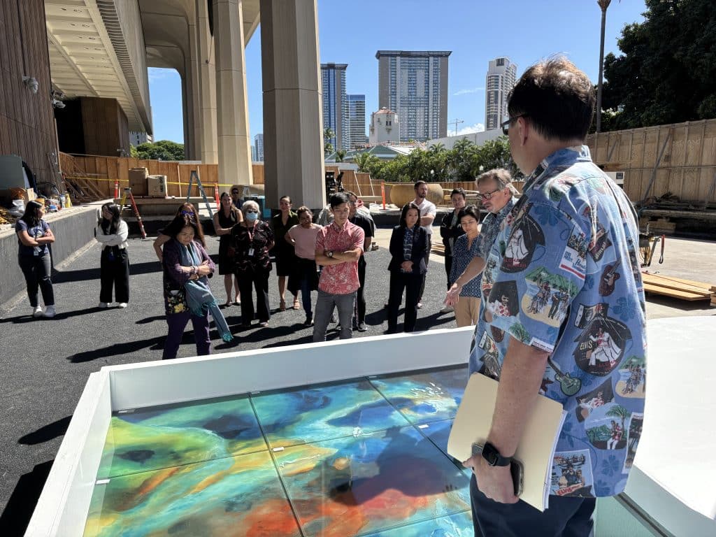 DAGS Director and Comptroller Keith Regan gives a tour of the glass pool mock up. Photo courtesy: DAGS.