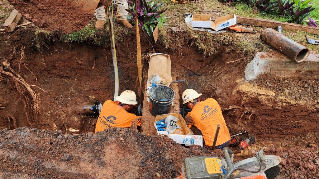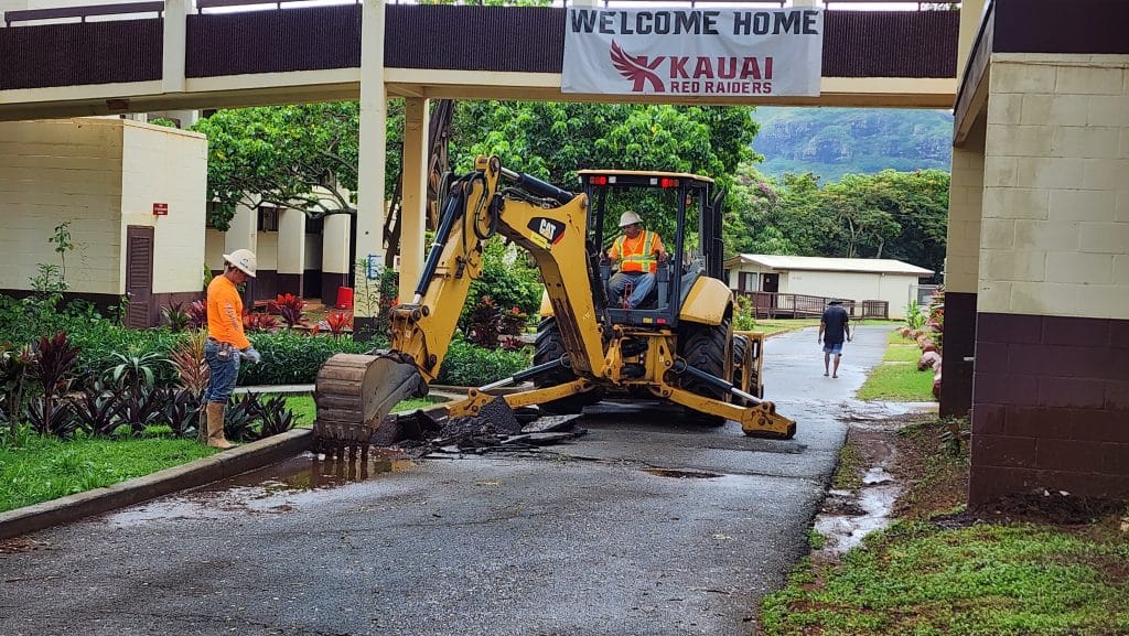 The DAGS District Office on Kaua‘i pulled out the stops on the Sunday afternoon of the Presidents’ Day holiday to coordinate and provide much-needed repair and maintenance services for Kauaʻi High School. A water line leak discovered on campus could not be isolated, so water service to the entire school needed to be shut off to prevent continued loss of water. However, in order for the school to reopen, water restoration was required for health and safety reasons. Thankfully a local contractor, Cushnie Construction, had a crew ready to perform the emergency repair on Presidents’ Day, and the Kauaʻi Department of Water was available and willing to kōkua. The repairs were made expeditiously so that the students could return to classes the next day. Kudos to the contractor, school, DAGS, and the Department of Water, who worked together so the school could open with no disruption to learning! (contributed by DAGS Kauaʻi District Office)