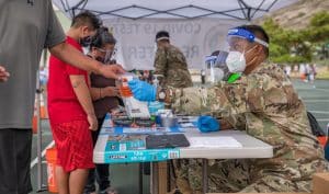 A member of the Hawai‘i National Guard assists with COVID-19 testing. Photo courtesy: Hawai‘i Department of Defense.