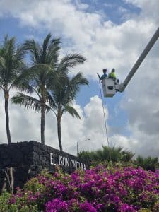HDOA staff applying crown treatment to the palm trees at Kona Airport. Photo courtesy: HDOA.