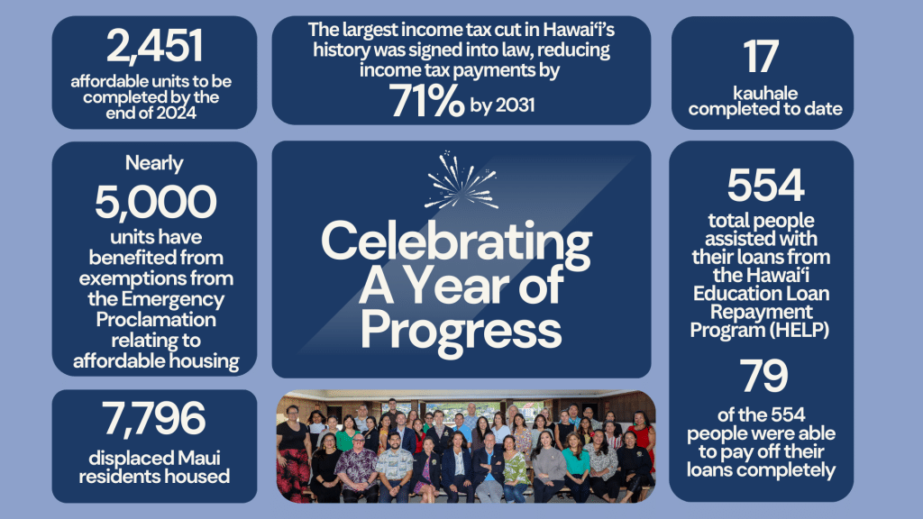 Over these two years, we have prioritized building affordable housing, lowering the cost of living, expanding health care access and investing in sustainable energy and our education system. Each of these initiatives aims to create a stronger and more resilient Hawai‘i, ensuring that our keiki can thrive and call this beautiful place home for generations to come. None of this would have been possible without my administration’s team of action-oriented leaders or our partners in the legislature who are committed to turning our vision into tangible progress for our state.