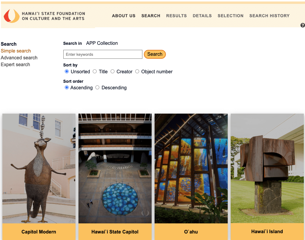 DAGS’ attached agency, the Hawaiʻi State Foundation on Culture and the Arts (SFCA), has a new SFCA Art in Public Places Collection database online. With one click, users can find artworks currently on display at Capitol Modern: The Hawaiʻi State Art Museum, the Hawaiʻi State Capitol and hundreds of state offices and sites around Oʻahu, Hawaiʻi Island, Kauaʻi, Lanaʻi, Maui and Molokaʻi. Individuals can search by artist, location, medium and more. The SFCA Art in Public Places Collection is supported by public funds through the SFCA Works of Art Special Fund. Give it a try at https://hsfca-ais.axiellhosting.com/search/simple, or reach out to SFCA at if you have any questions!