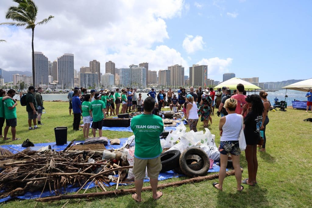 After signing the pledge on April 21, the Governor’s office followed through on its commitment on Earth Day, April 22, by participating with Aqualung, PADI, and numerous dive shops and community members in an attempt at the largest self-organized dive and beach cleanup at Ala Moana Beach Park. Hundreds of divers combed the waters for debris and brought it up for those on land to assist with disposal. Debris totaling more than 5,000 pounds was hauled away at the end of the event.