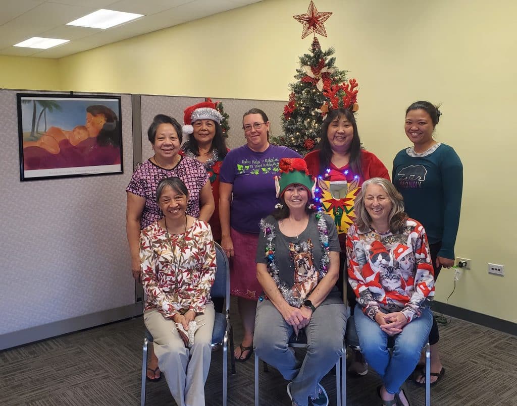 Supported by the WIC main office, they managed to get laptops enabling them to work remotely and even used personal cell phones to ensure the clinic could operate. Eventually the supervisor was able to find another office in Wahiawā and get a work cell phone that could be used while arranging for replacement landlines. Team members worked hard to keep each other safe during the challenging times of the pandemic while having to modify how and where they worked. The team has been in its new office for a year now and celebrated its reunion in December 2022.