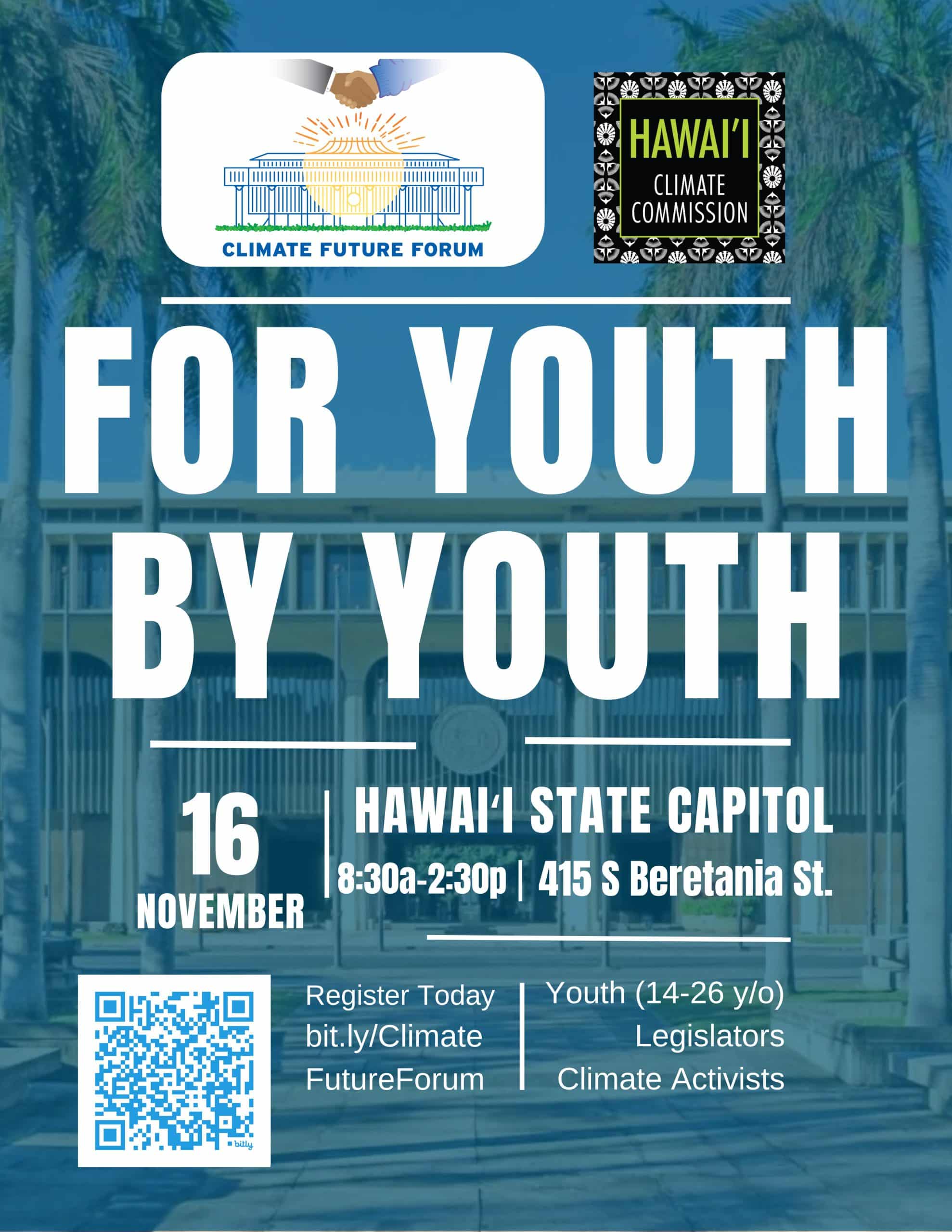 Climate Future Forum www.climatefuturehawaii.org – (open to youth ages 14-26) Senate Floor, Capitol, 8:30 a.m.-2:30 p.m. – Register HERE